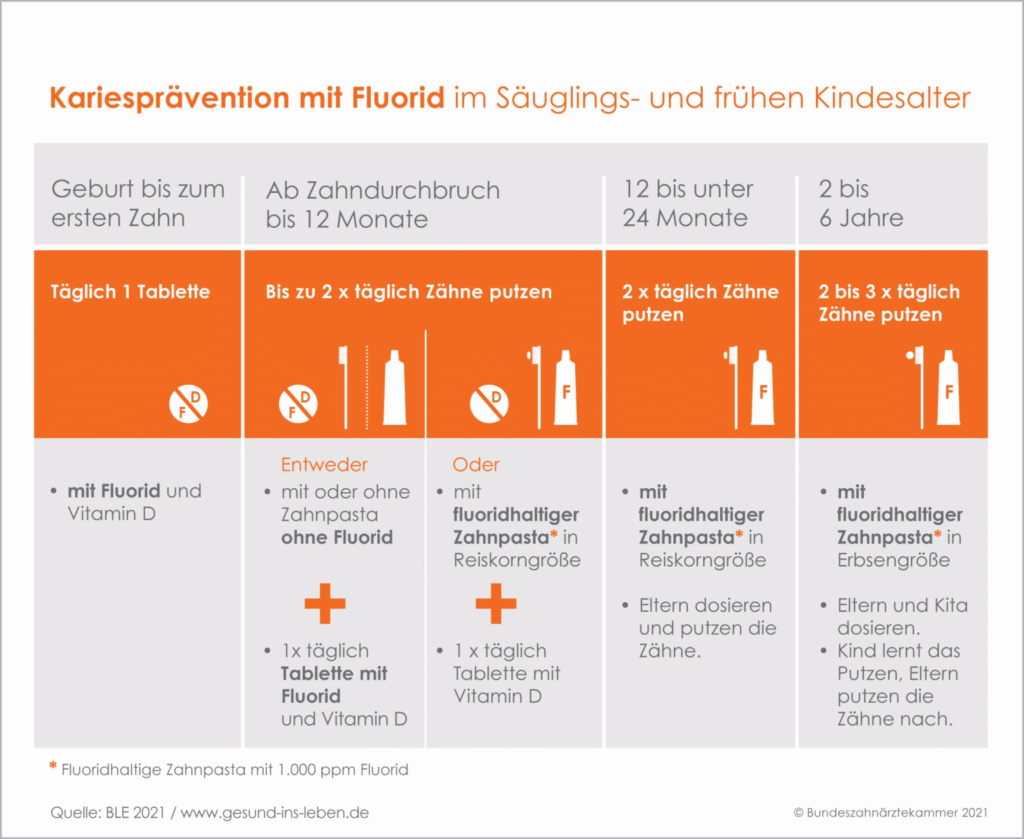 Die Verwendung fluoridhaltiger Zahnpasta wird ab dem ersten Zahn empfohlen, spätestens jedoch mit dem ersten Geburtstag.